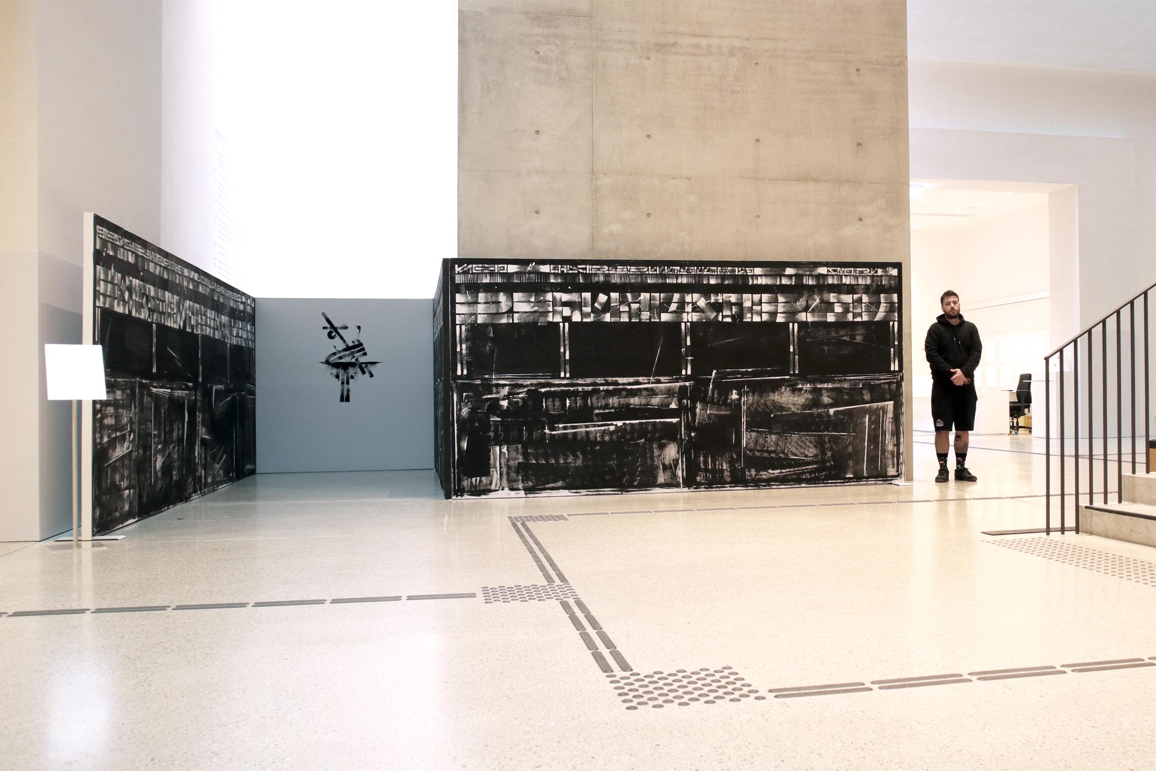 From now until the end of September, the Foundation is presenting four large-format paintings by the artist The Krank. They were created during this year's Long Night of Museums, during a live performance by the artist. The theme of the works is Zufluchtsstadt Berlin. Born in Greece in 1988, the artist's artworks are inspired by his own family history and the experience of his grandfather, who fled the Greek-Turkish war in 1921.
